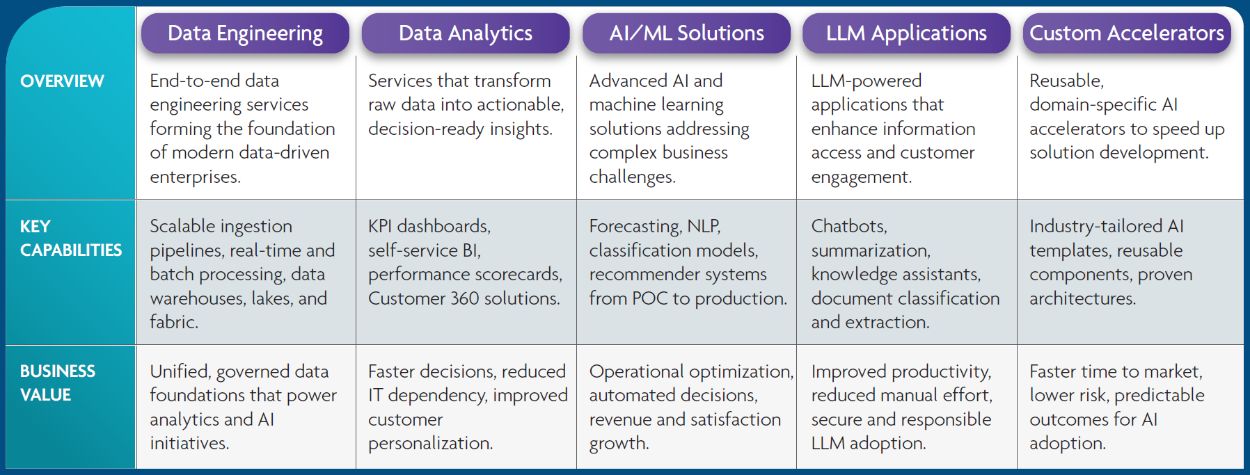 We partner with you from strategy to implementation – modernizing your data foundation, activating insights, and embedding AI into workflows – so your organization can move faster, operate smarter, and innovate continuously.
